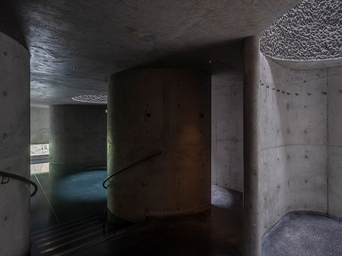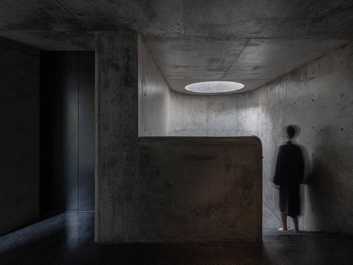 the third floor features bathing pools under skylit light wells that diffuse sunlight softly
