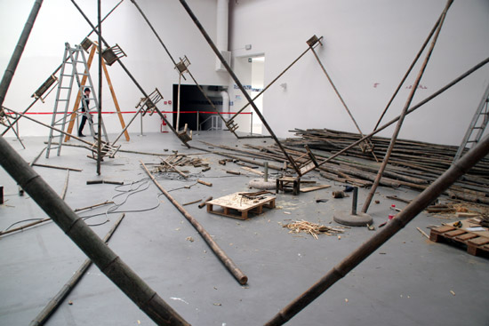 bamboo chairs are placed along the framework of bamboo poles image © designboom