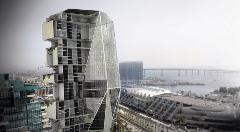 in response to an exponential growth in population and current trends in unsustainable food consumption, san diego architect brandon martella has proposed a new high-rise building typology that integrates an expansive farm and market into the american urban landscape. the vertical farm skyscraper is an architecture that responds to a burgeoning economic and environmental issue– a problem of fruit and vegetable supply not meeting the 320+ kilogram per person demand in the united states. since the bulk of produce for san diego comes from both the imperial and central california valleys, the issue of food sustainability and acquisition is one of increasing importance in the region. half residential tower, half 23 acre farm, the project aims to become both an economic powerhouse and spectacle in addition to producing a projected 266,796 kilograms of food every three months. the 152 meter tall expanse of crops would be protected by glazing and use recycled grey water from the building to create a viable aquaponics network. additionally, harnessed black water would become part of a compact combustion system for thermal energy. the urban farm-to-market model not only provides locals with homegrown food, but the structure’s proximity to the waterfront and convention center also make for the site to become a tourist and educational destination. the social exchange of farmer and resident is also central to the project, made manifest in the ground floor commercial space as well as a tenth storey void that pushes residential circulation areas into the center of the farm. while meeting areas are alternately double height or more intimate, apartments are interlocking 92 and 55 square meter units, spatially informed by le corbusier’s marseille block. the building is one that posits an encompassing solution to myriad behaviors by creating a consciousness in consumers of space, commerce and culture.