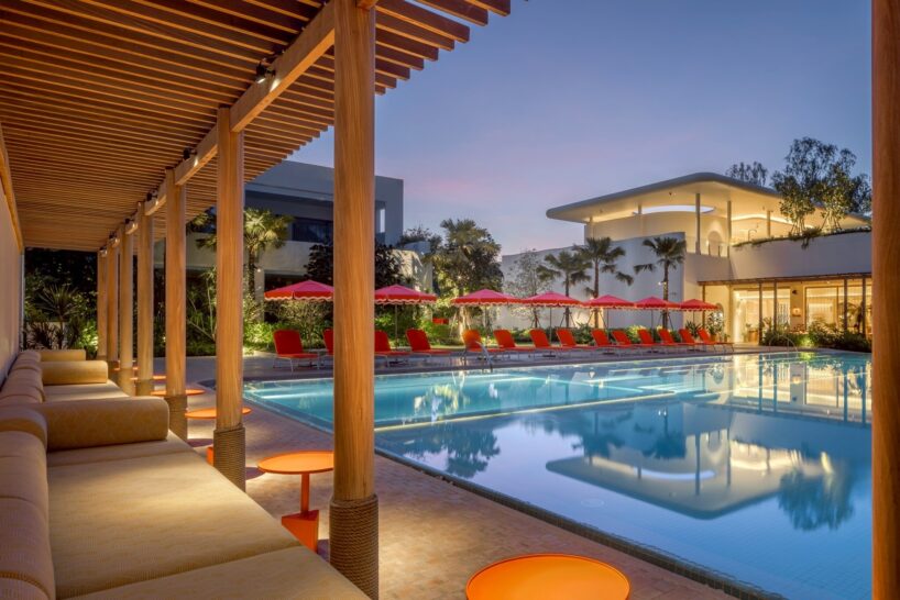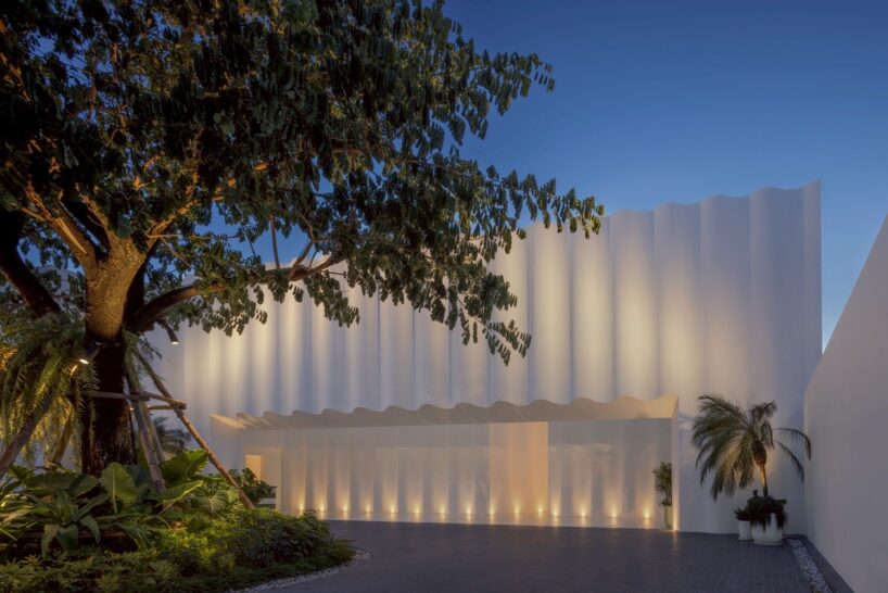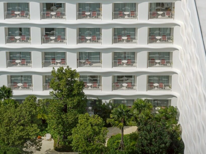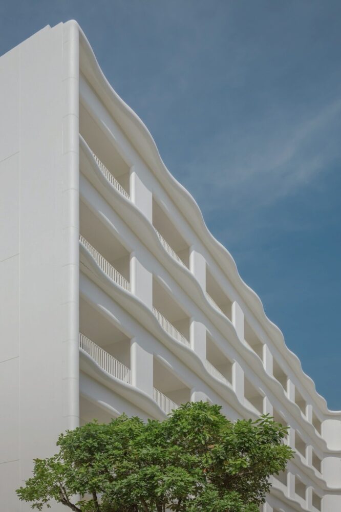 vertically articulated wave-like forms define the hotel’s primary facade