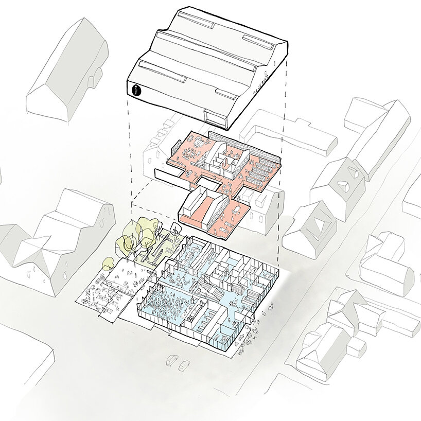 at the ground floor, citizen services, café, and a flex-room for workshops are placed. this ensures a dynamic space with synergy between the different activities of the house and easy access for the town’s citizens. the library is located on the first floor and is designed as an open floor where all spaces are linked together.