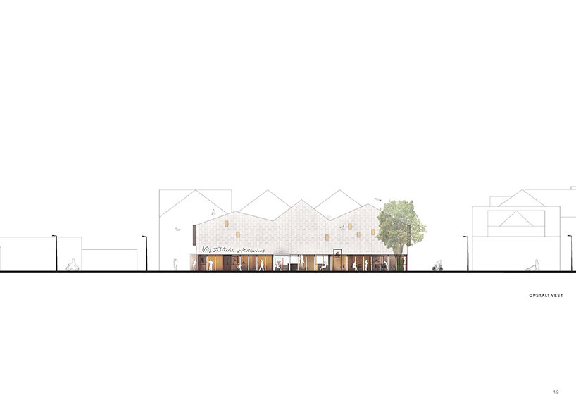at the same time, the building’s architecture references to the history of the town, specifically the cooperative dairy plant that was formerly located at the site. the distinctive gabled roof of the culture house is a modern interpretation of the dairy’s profile in the cityscape, while the façade’s white ceramic tiles is a reference to the dairy plant’s industrial wall tiles. thus, the house becomes a monument, celebrating the history of viby, that residents can further explore in the archival section of the house.