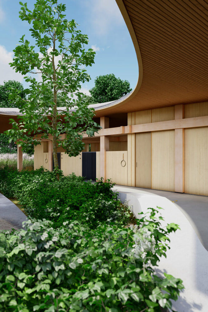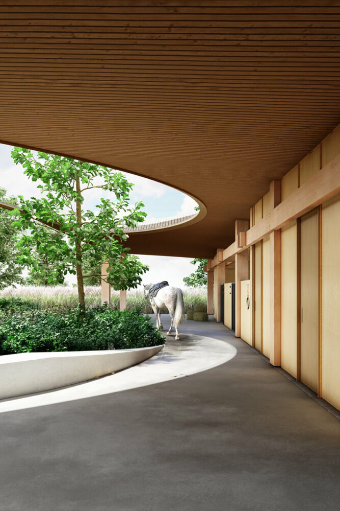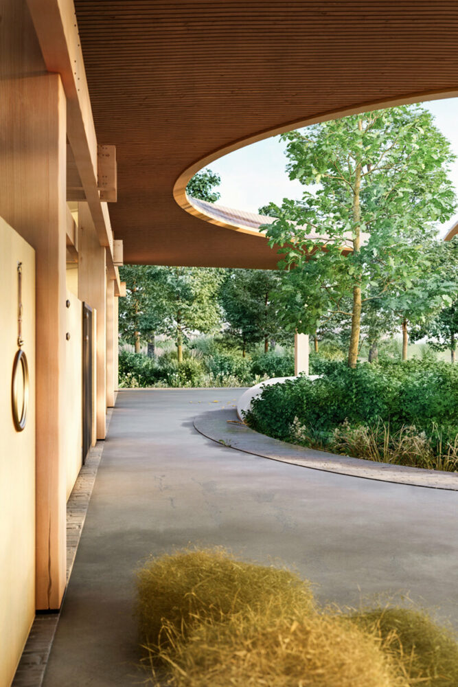 the project sits like a ring placed over the terrain, with its funnel-like roof forming a shaded perimeter walkway and an introverted core.