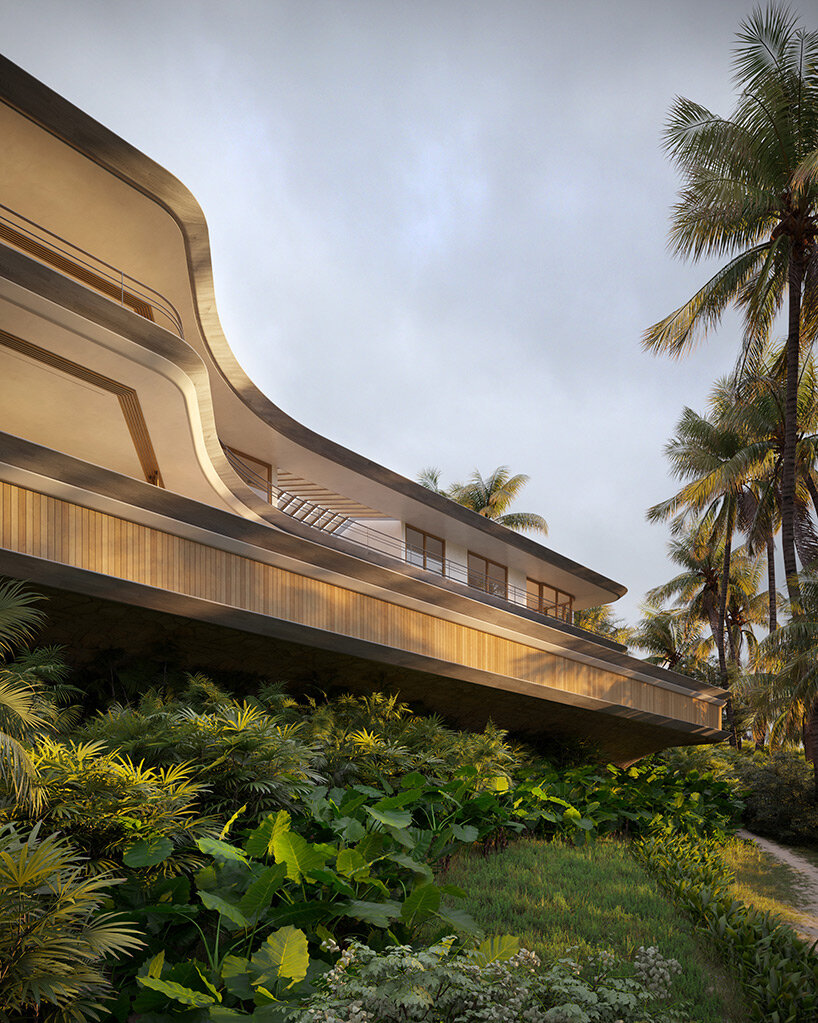 the project sits like a ring placed over the terrain, with its funnel-like roof forming a shaded perimeter walkway and an introverted core.