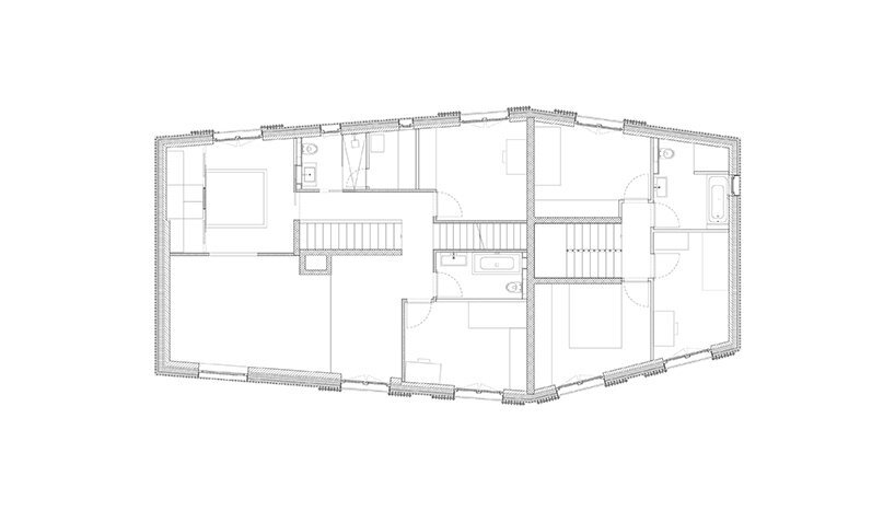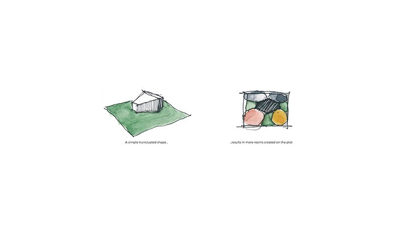 the project sits like a ring placed over the terrain, with its funnel-like roof forming a shaded perimeter walkway and an introverted core.