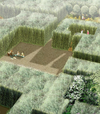 the project sits like a ring placed over the terrain, with its funnel-like roof forming a shaded perimeter walkway and an introverted core.