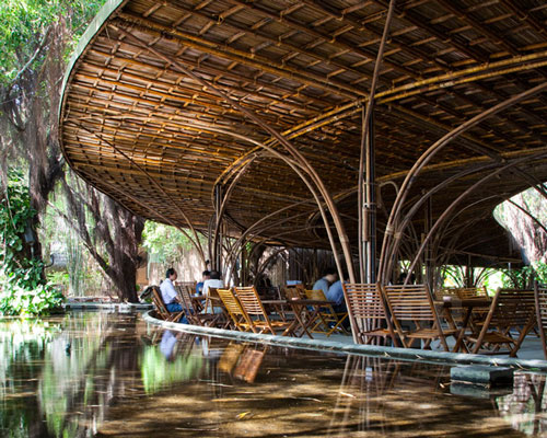 set amid vietnam’s tropical landscape vo trong nghia architects has developed ‘wNw café’ a project which is defined by its experimental use of bamboo. surrounded by an artificial lake, the café consists of thousands of bamboo shoots, which ensures the minimal use of steel and other materials. the roof has been constructed from a combination of bamboo and steel tensile members, creating a vast internal space spanning 12 meters, while the form of the structure is shaped to maximize wind-flow through the building on hot sticky days. traditional processing methods for the bamboo allow the shoots to display their characteristics as flexible, durable and cost effective housing materials.