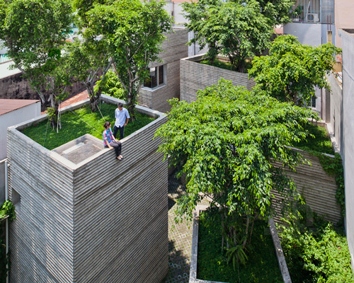 in response to the rapid and near total urbanization of vietnamese cities, vo trong nghia architects has designed a prototypical house as part of an ongoing initiative to reverse the trend. built within ho chi minh – a region where only 0.25% area of the city is covered with greenery – the dwelling seeks to reconnect its residents with the natural environment. entitled ‘house for trees’, the scheme comprises five individual concrete boxes envisioned as planters. as a result of the unit’s thick layer of soil, the dwellings also serve as basins, retaining water and reducing the risk of flooding.
