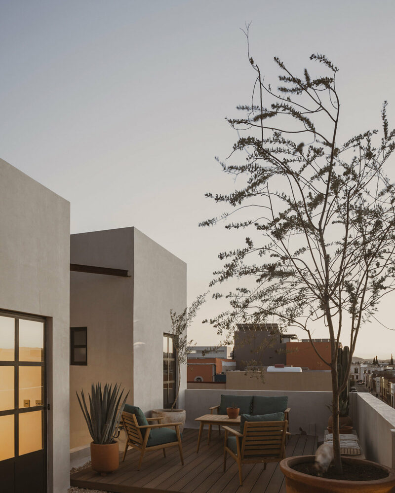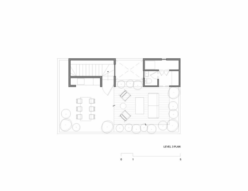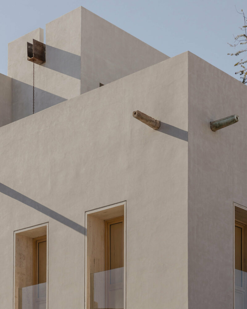 the project sits like a ring placed over the terrain, with its funnel-like roof forming a shaded perimeter walkway and an introverted core.