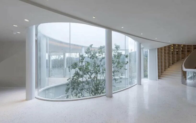 the project sits like a ring placed over the terrain, with its funnel-like roof forming a shaded perimeter walkway and an introverted core.