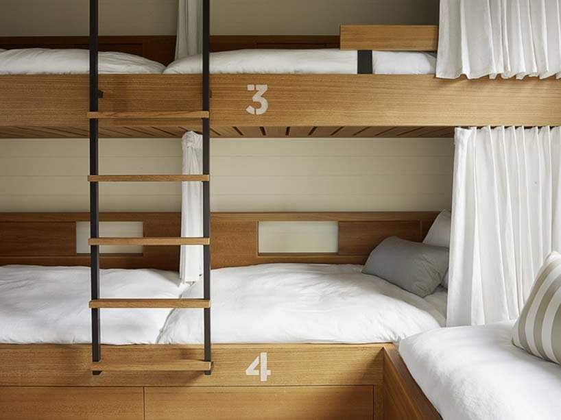 ‘A connected indoor-outdoor room provides space for an outdoor bar, sitting area, and outdoor grill. Furnishings are modest and comfy, providing ship-like efficiency. Sand colored floors and walls run through the interior, with ceilings and cabinetry clad in wood to match the ceiling beams.’