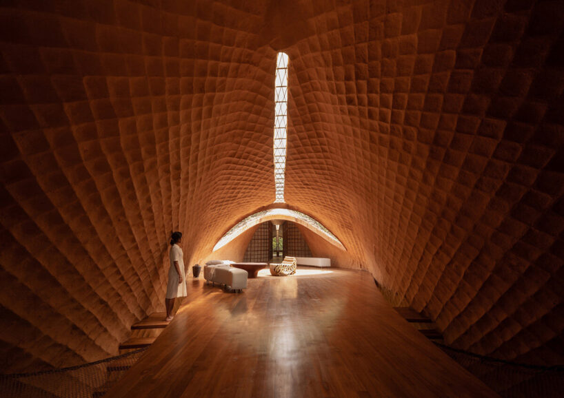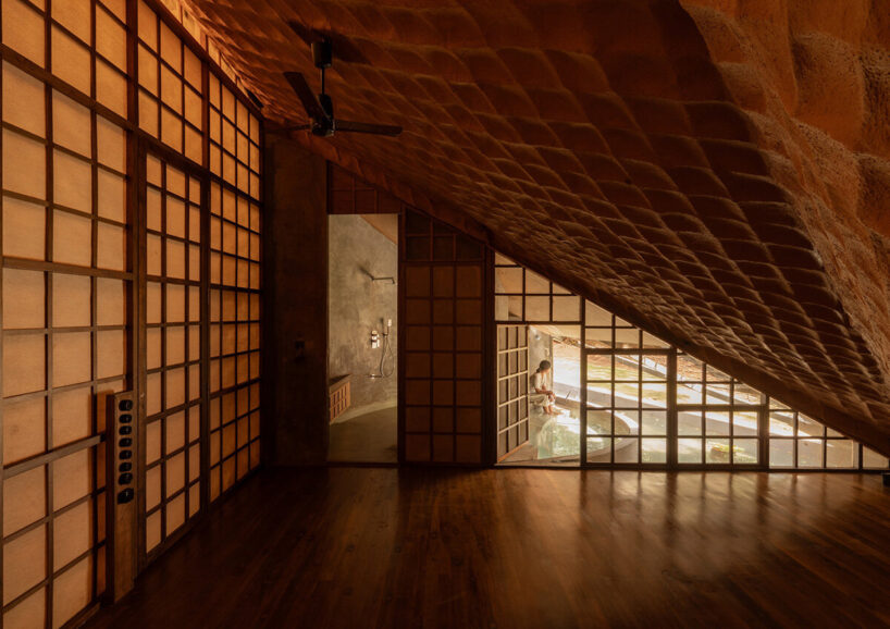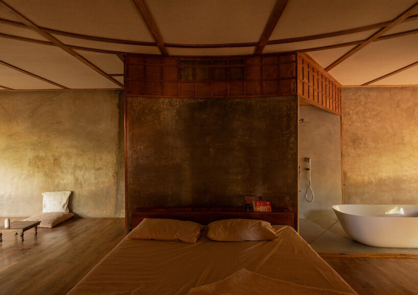 reclaimed ship-deck wood, jute, and mesh screens define interior finishes