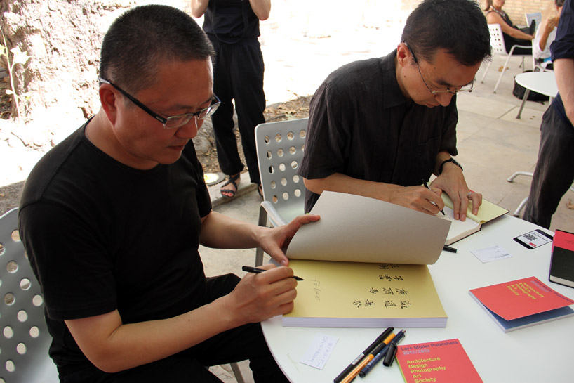 wang shu with sou fujimoto at their book signing during the venice architecture biennale at the swiss pavilion