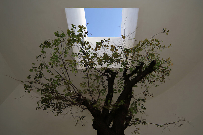 A narrow wooden bridge leads to the main entrance, where visitors pass through a door made of rusted steel and glass. Inside, a foyer holds a tree crowned by a skylight at its center, offering a distinct and instantly calming ambiance. Like a courtyard, the foyer connects and leads to five other circular rooms through doorless passageways echoing each other to produce a sense of layering with unique spatial rhythms.