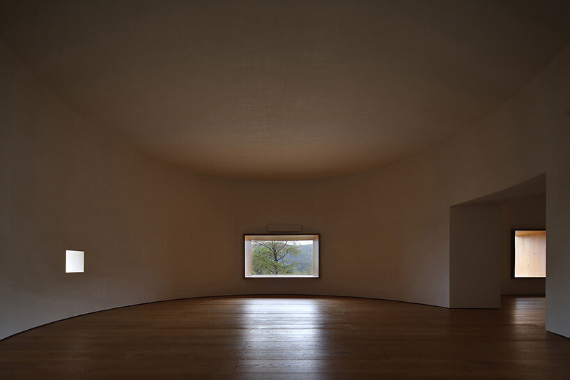Shazi embellished the six areas with indoor landscapes and framed views of the mountain scenery thanks to subtly carved-out wall openings, creating a unique play of light and shadows. To unify that spatial ambiance, the architect combined tactile wooden floors with expansive thick walls, plain textured coatings, vents hidden near skirtings, and unadorned ceilings, further accentuating the circular design.
