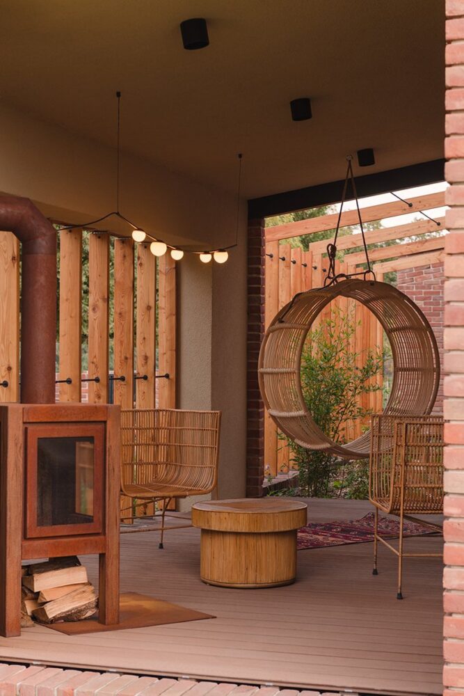 architectural studio GAB built a house that connects deeply with its natural surroundings in poznań, poland. brick and wood façades compose the family home, while the neutral materials and tones blend seamlessly with the natural setting, generating a warm background for peaceful family life. meanwhile, multiple large openings complete the structure, offering unobstructed views of the verdant site and the lake nearby.