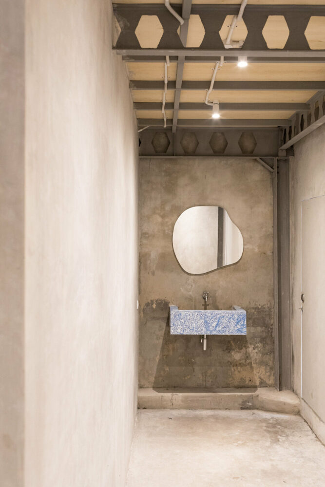 the project sits like a ring placed over the terrain, with its funnel-like roof forming a shaded perimeter walkway and an introverted core.