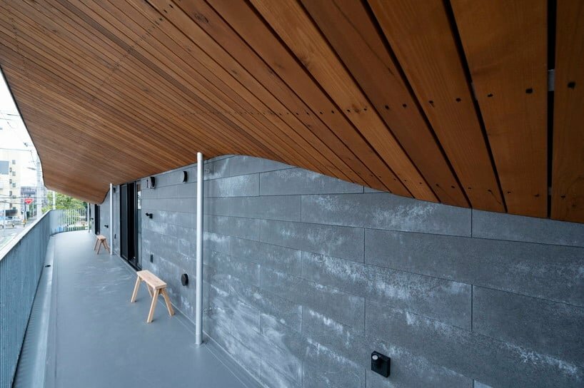 the undulating balconies are covered in wooden eaves running along the curves of the construction