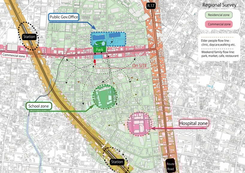 the three-story leased commercial building stands on the border of a residential area in Saitama, Japan