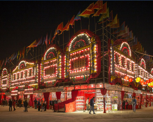 set against the backdrop of the city’s iconic skyline, the theater interrupts the modern, urban landscape with its use of ancient materials, generating a dialogue between traditional and contemporary forms of architecture. created from over 12,000 bamboo rods, the opera house is illuminated by tiny, studded bulbs, and decorated with yellow and red lanterns, leading visitors to the interior program space. highlighting shows across an wide range of xiqu genres, the pop-up space makes the historical art form accessible to new audiences, while a xiqu cinema presents films of celebrated past performances. fung envisions the space as ‘a physical and metaphorical site for families and friends to gather during the festive lunar new year celebrations, and of a meeting of the various cultures and forms of opera’