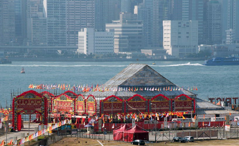 from now until february 9th, 2014, the bamboo mega-structure is hosting one of the world’s leading festivals celebrating xiqu and other forms of chinese and cantonese performances, encouraging public engagement with the site and fostering local and international connections. each year, the building is constructed specifically for the festivities, with varying layouts and architectural details revealed with every new iteration, and finally is dismantled at the event’s close. the 2014 design is defined by its giant oval bamboo gateway and 180 degree views over victoria harbor.