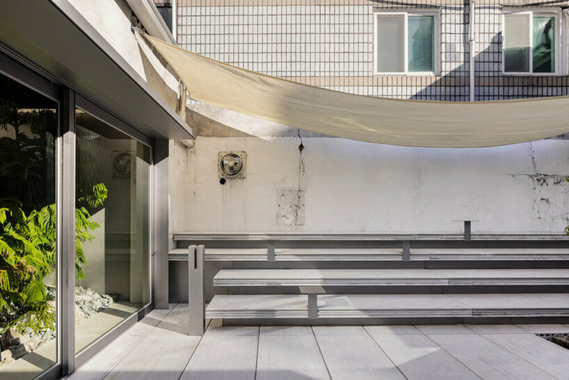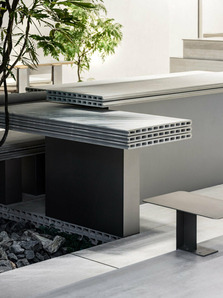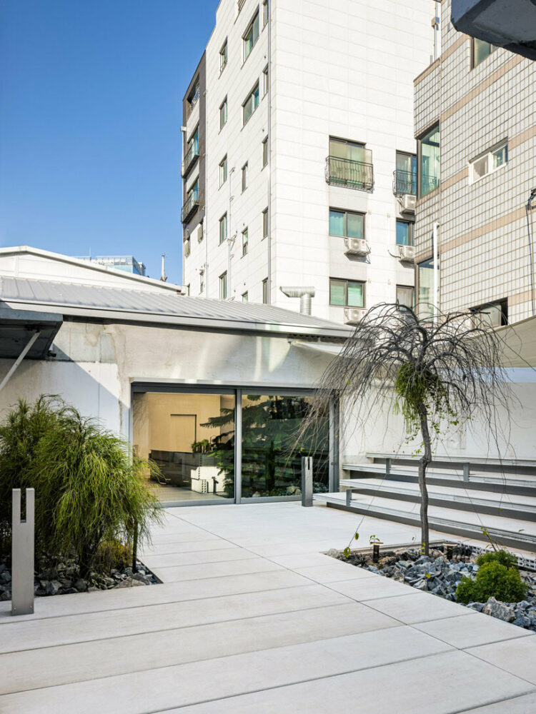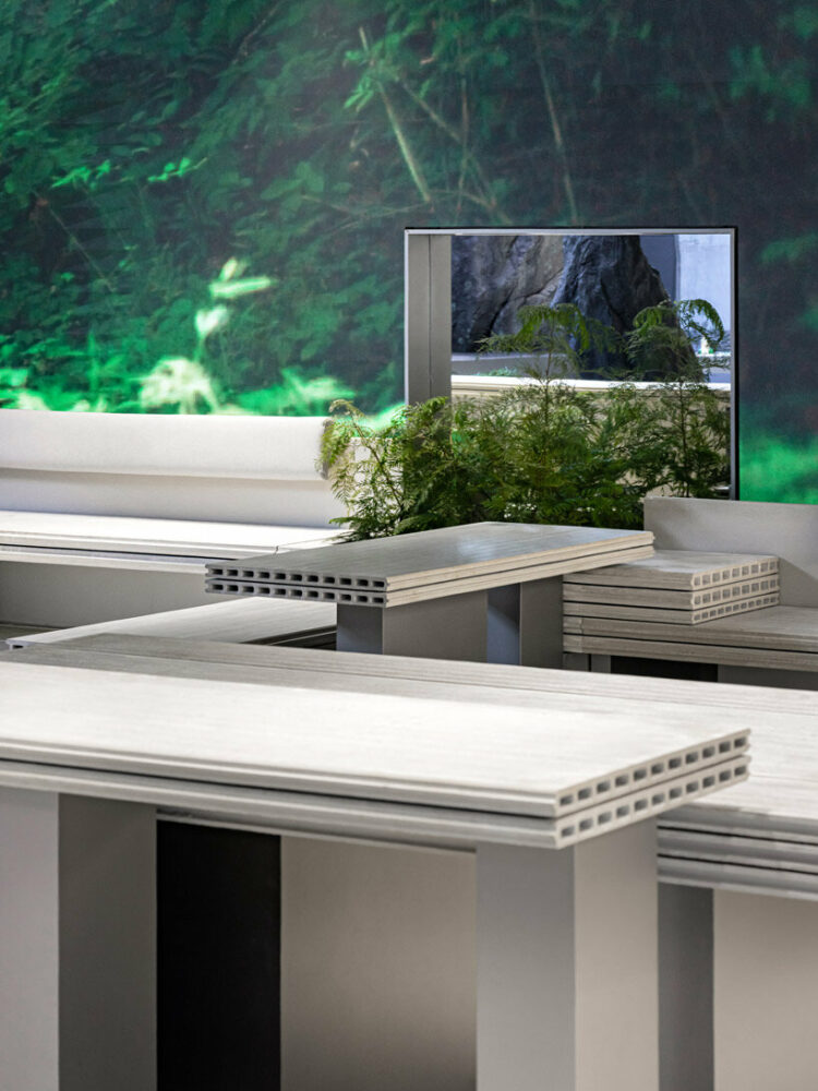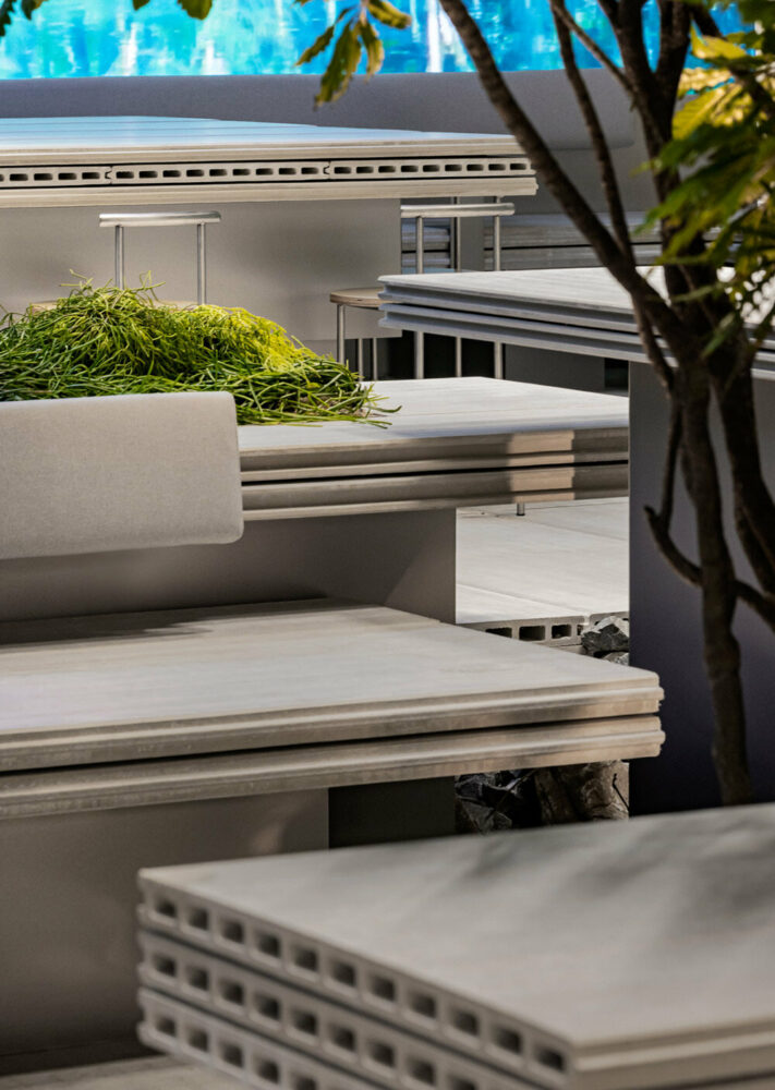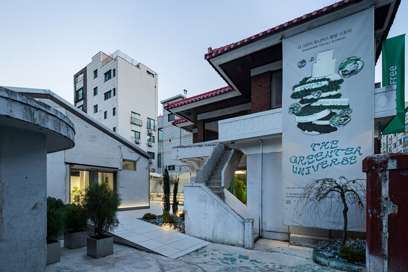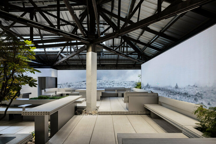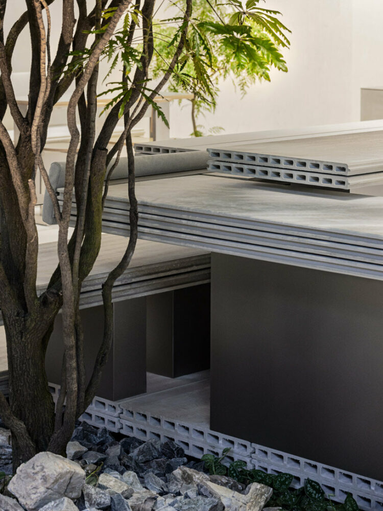 The Isle stands as a creative addition to the retail scene, where beauty, creativity, and a hint of nature converge within the city’s bustling atmosphere. Departing from the usual retail setup, the store incorporates raised platforms, seating, and tables, creating an unconventional yet inviting environment for exploration. Utilizing innovative BACE (Byucksan Autoclaved Cement Extrusion) panels —commonly used in architectural facades— the store’s interior combines durability with an essence of the outdoors. This design choice by WGNB aims to infuse a touch of nature into the urban setting, offering customers a different shopping experience. Besides hosting Innisfree’s skincare and cosmetic products, the store integrates a café setting, allowing shoppers to enjoy beverages and food while exploring the products.