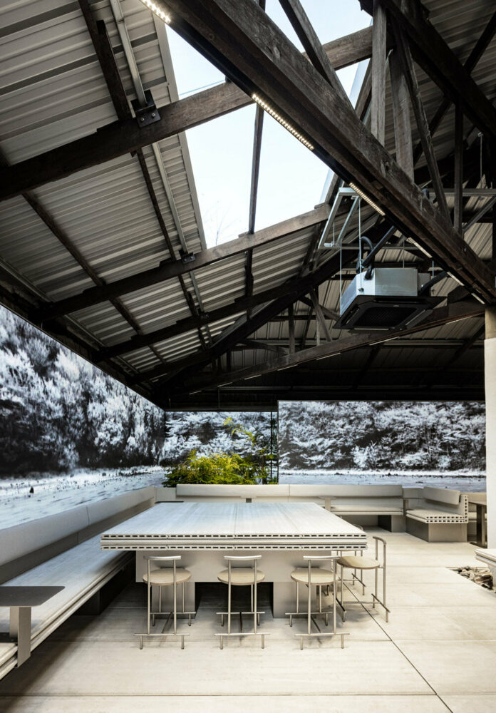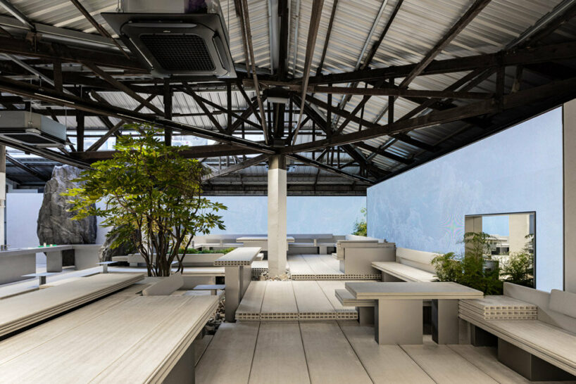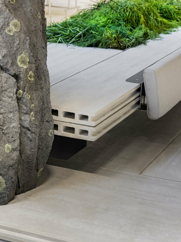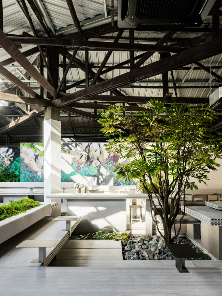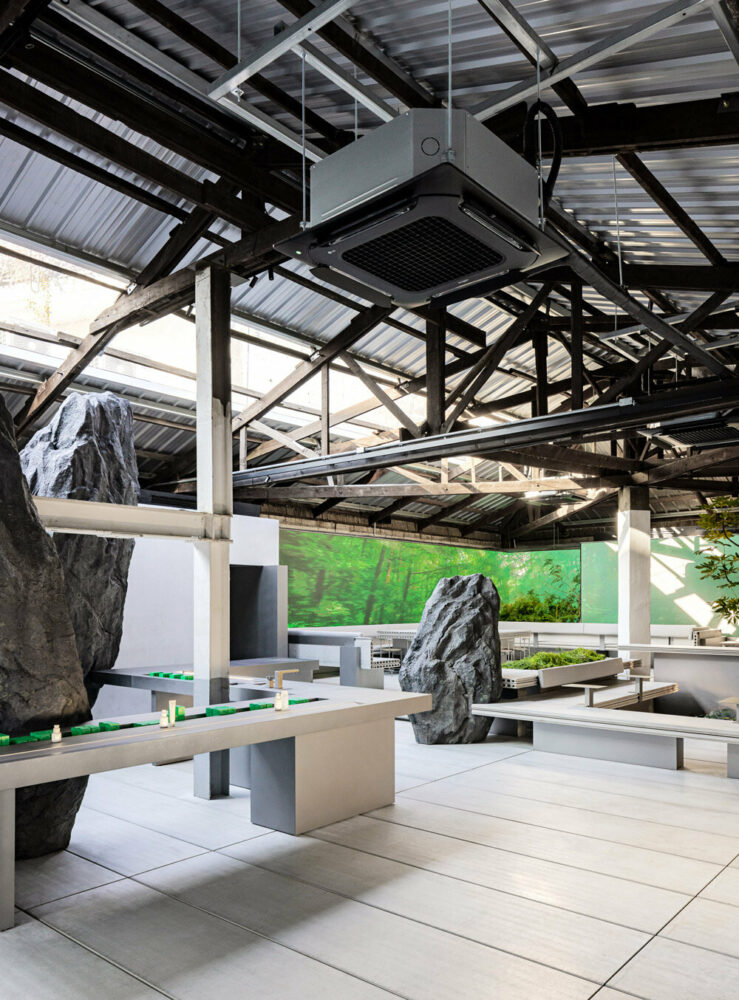 Design and architecture studio WGNB has crafted The Isle for the Korean cosmetic brand Innisfree, offering a fresh take on beauty retailing within Seoul’s urban landscape. Embracing the theme of an imaginary island where there is potentially no flat plane, the project reflects its landscape within an urban setting. The contour lines of the island are reimagined as various elevated levels, forming platforms, seating areas, and tables within the space. Meanwhile, large rocks delicately dress the columns or stand independently, evoking a natural ambiance and creating an exciting interplay of voids and solids alongside the exposed roof. The design introduces a pristine touch, where bursts of green contrast against the white color palette that envelops the entire space. The intentional use of natural elements breathes a refreshing character into The Isle, creating an atmosphere that merges modernity with the serenity of nature.