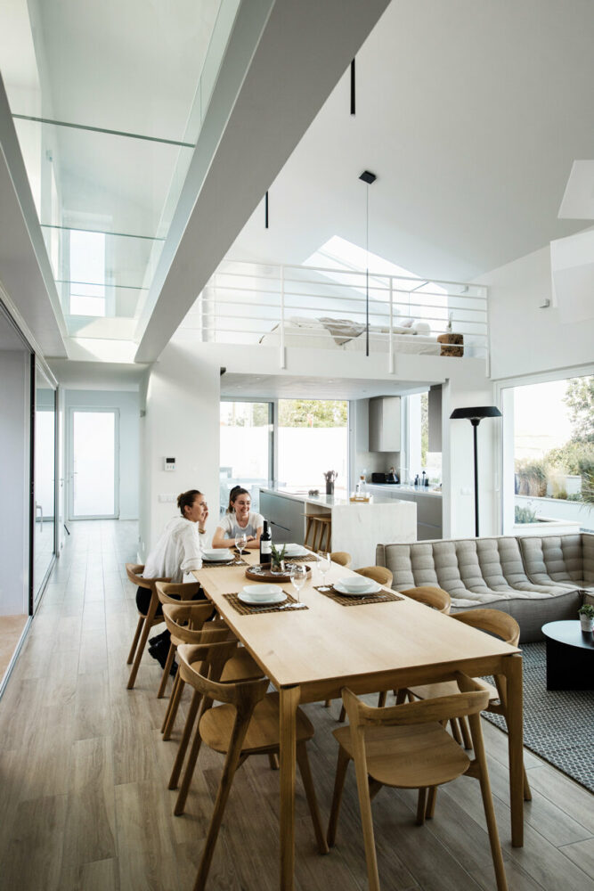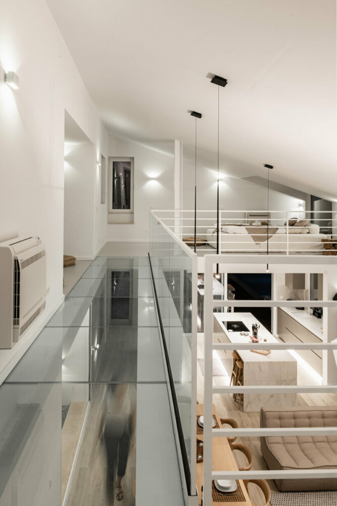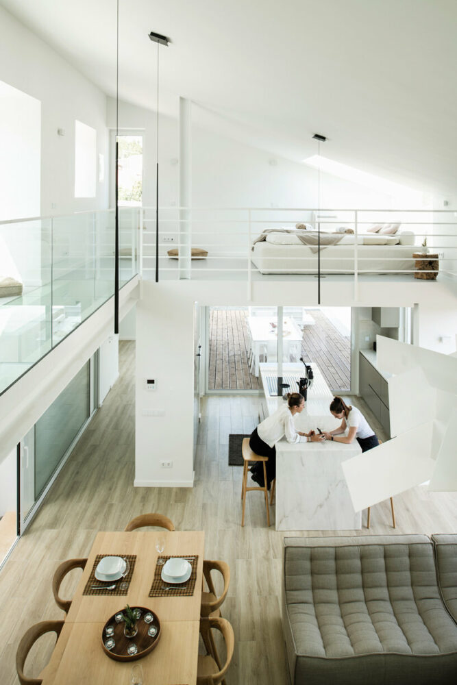 The pure white volume of Casa Simão shapes solid geometric forms that develop in multiple levels and open up glass windows and doors offering tailored natural sunlight and creating various indoor-outdoor spaces. The interior arrangement of the space constructs suspended glass walkways that offer easy circulation and visual connection between the floors. The residence is designed under bioclimatic principles such as solar energy utilization, thermal inertia temperature regulation, and passive housing building standards. The exterior zones are planned after a dry garden landscape concept. The minimalist structure by Studio Arte gems the countryside of the Algarve with its white geometric shapes framing the rich greenery of the region.