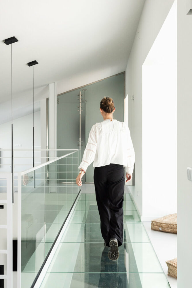 the space constructs suspended glass walkways that offer easy circulation and visual connection between the floors