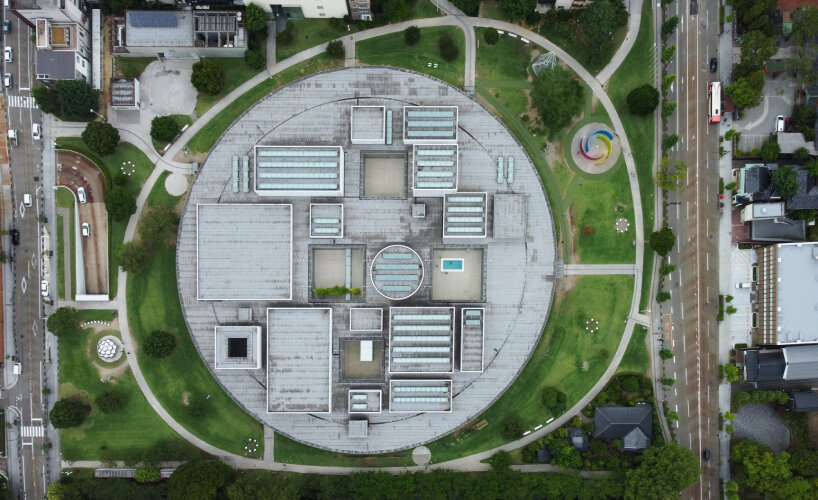 the project sits like a ring placed over the terrain, with its funnel-like roof forming a shaded perimeter walkway and an introverted core.