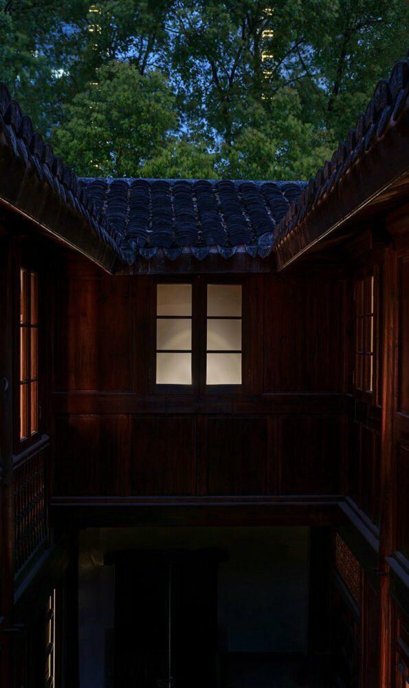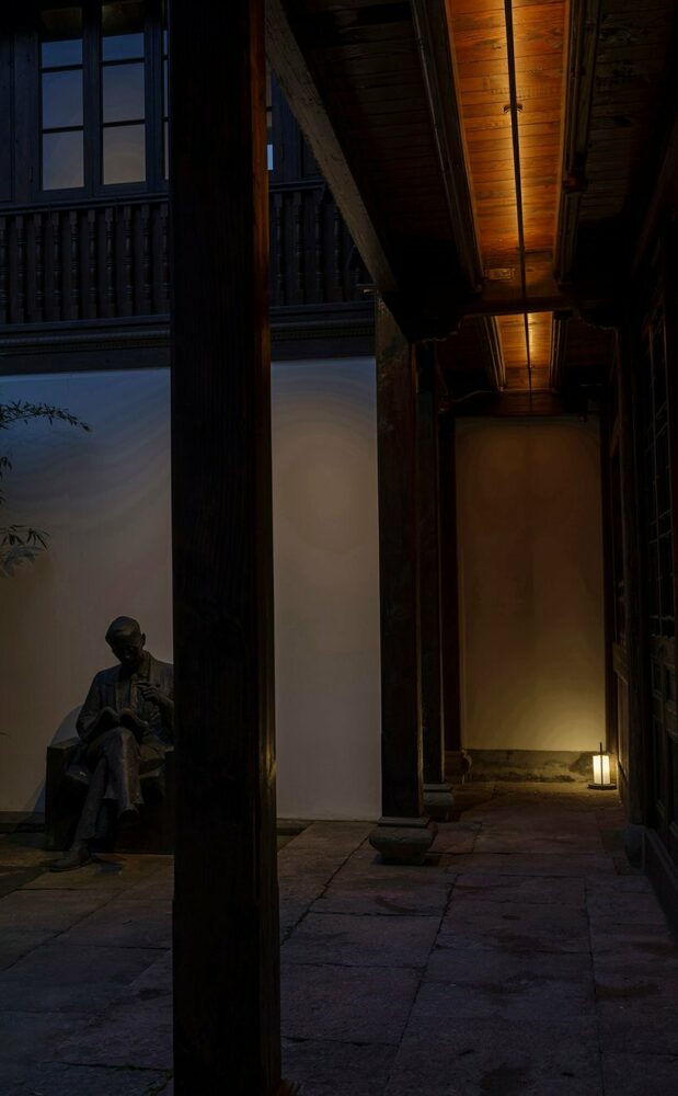 The conception of this project was commissioned by the Dong Fureng Foundation, led by Dongsheng Chen, a student of the prolific economist. His former residence, with blue tiles and mottled white walls, sits quietly along Ningbo’s historic cement road as an elegantly timeless stamp among a surrounding streetscape of high-rise buildings.