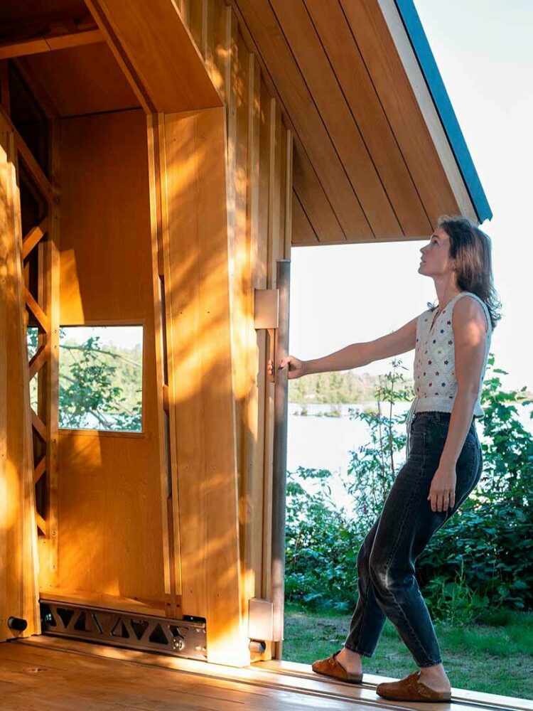 the wooden cabin forms a sliding double shell that can open up and become part of its surroundings
