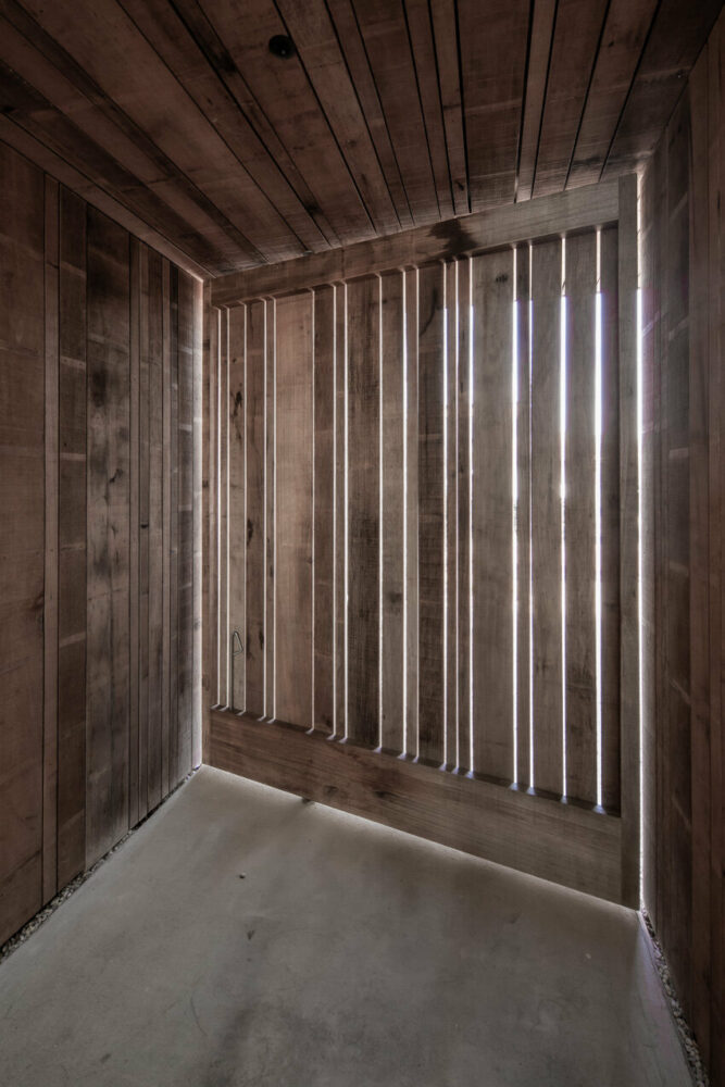 in the evening, light shines through the gaps of the cladding elements