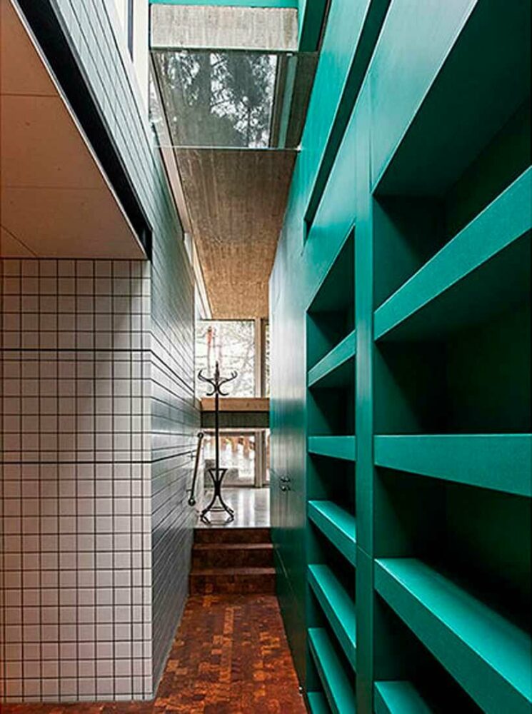 the rainwater collector holds the water on one floor and draining it as a natural shower in the pond below