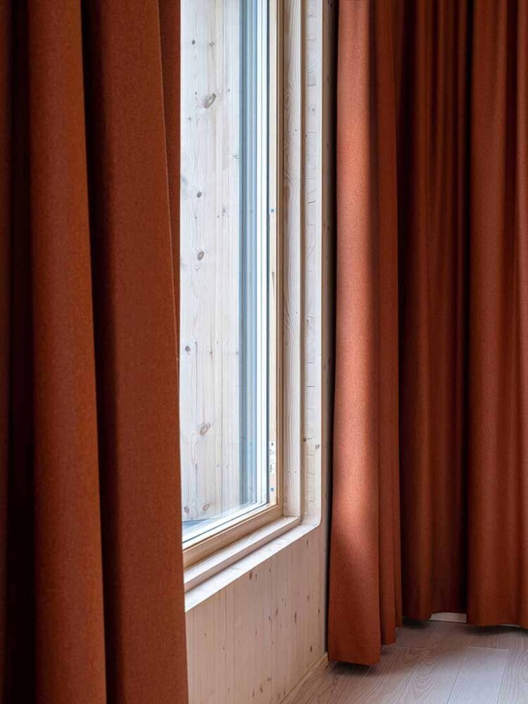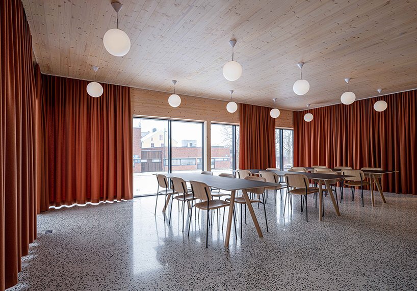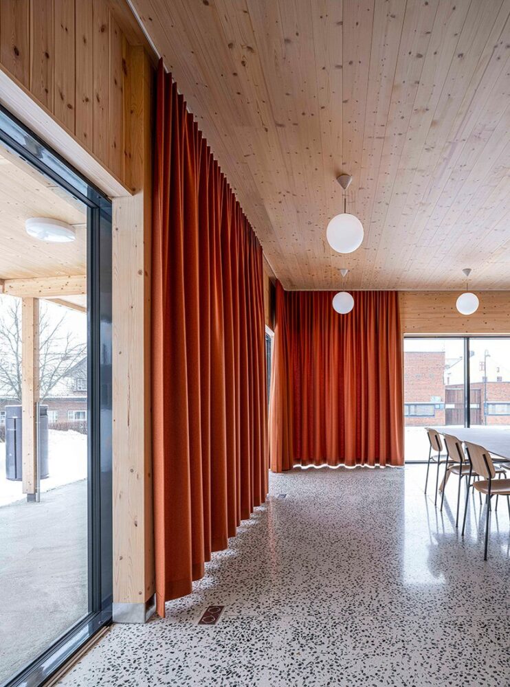 a fully integrated ventilation system hidden behind the ceiling and walls allows air to circulate through timber slats without any visible appliance or grilles. a carefully chosen material palette includes visible CLT surfaces and pine timber slats in walls and ceiling. the architects selected green terrazzo flooring for some rooms, and warm red acoustic textile curtains add a playful touch to the otherwise muted interior. the building’s form and technical solutions made it possible to achieve a cost-effective construction while retaining high quality in detail.