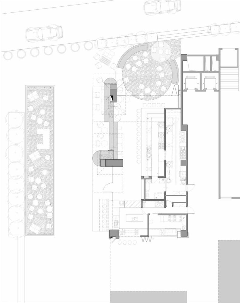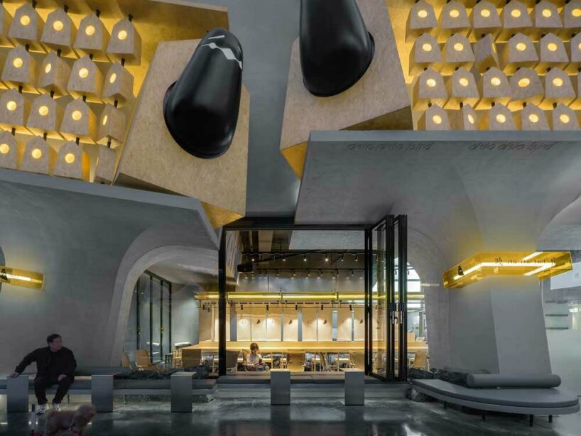 the project sits like a ring placed over the terrain, with its funnel-like roof forming a shaded perimeter walkway and an introverted core.
