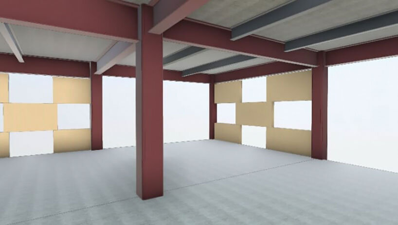 the project sits like a ring placed over the terrain, with its funnel-like roof forming a shaded perimeter walkway and an introverted core.