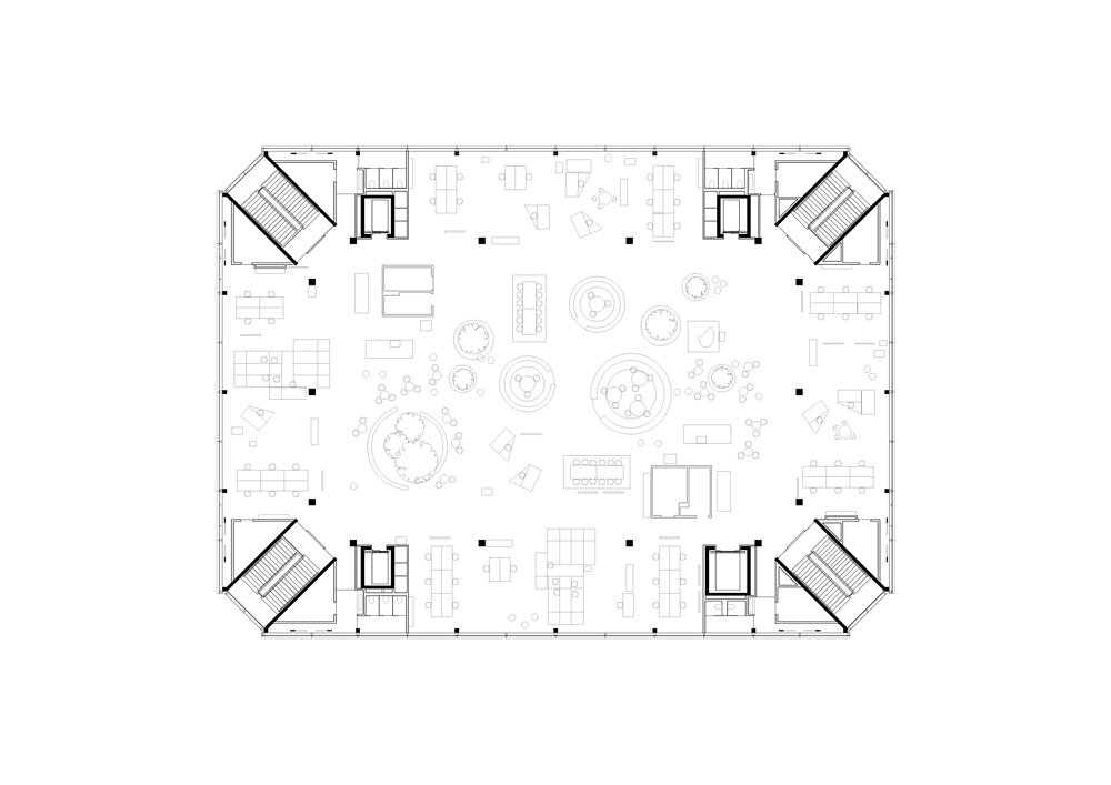 (C&G): the multifunctional workspace building provides an alternative to the traditional office and home office. it brings people together in an environment that is more than a conventional office. with flexibility at its core, it enhances the non-digital exchange between individuals, groups, and the firm as a whole.