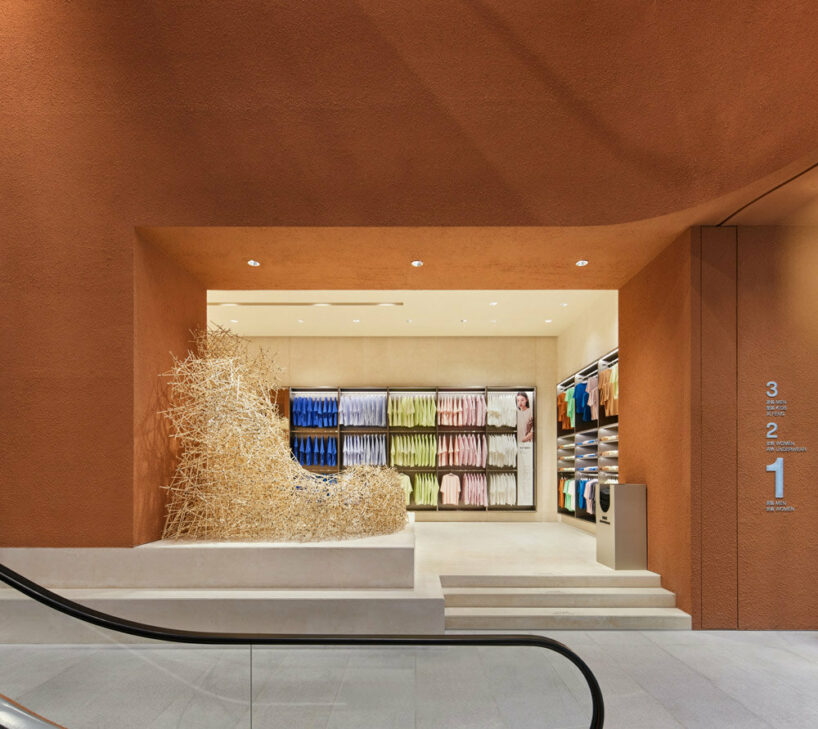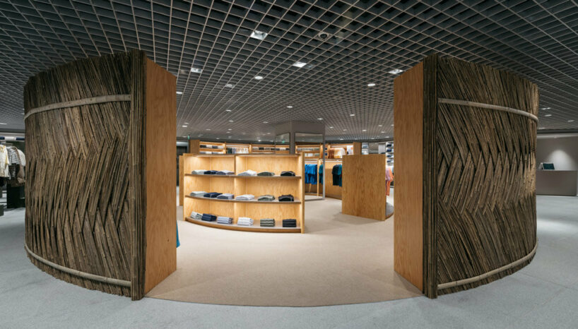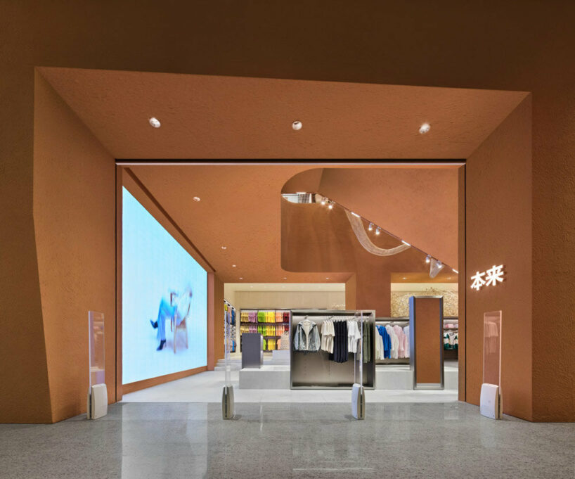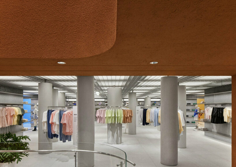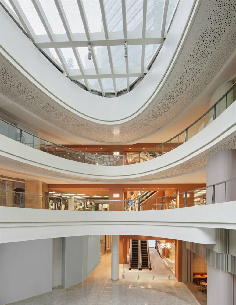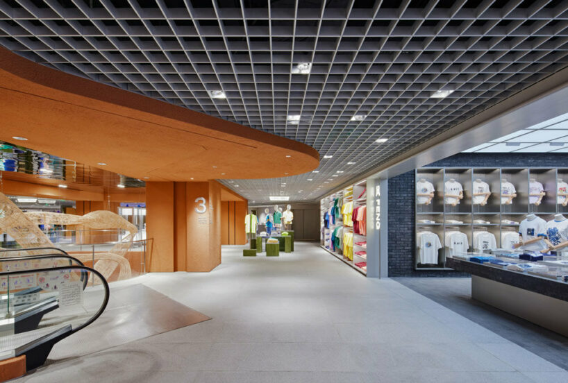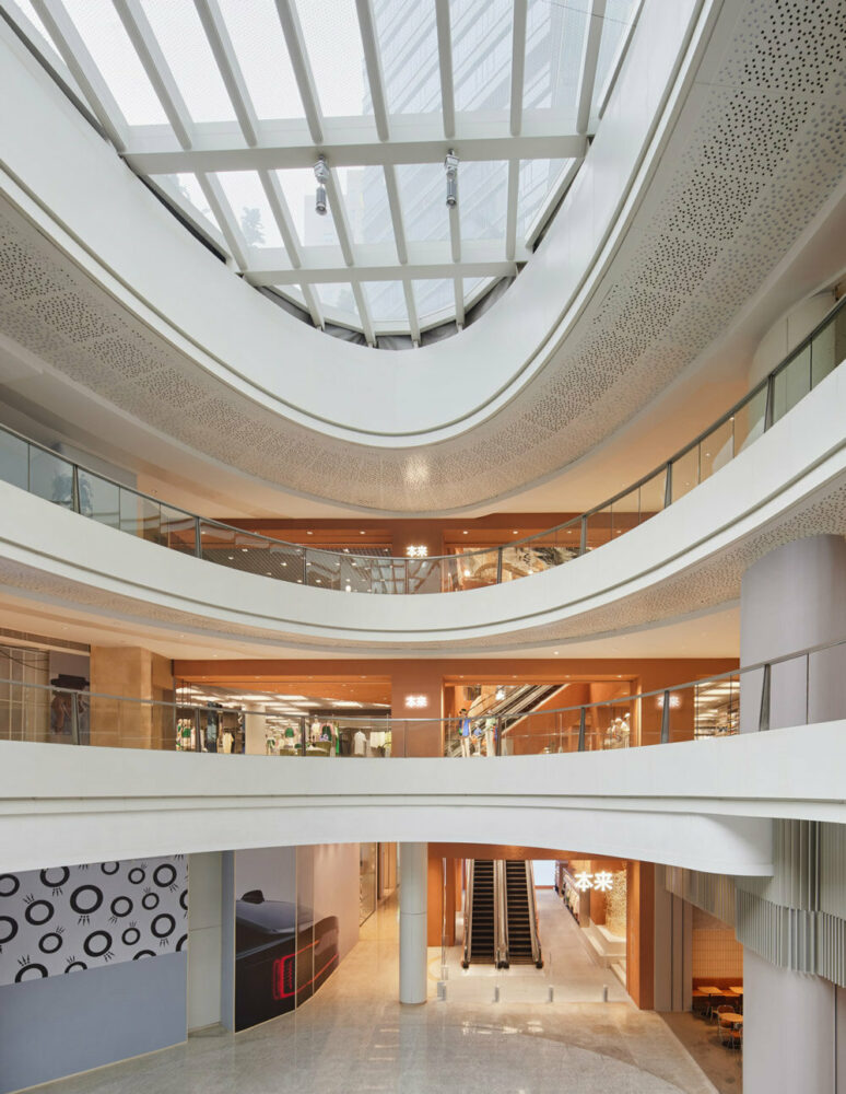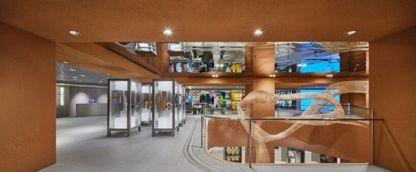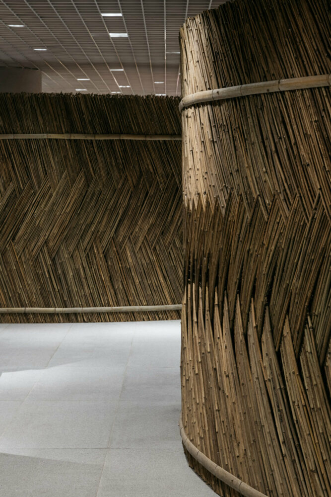 the project sits like a ring placed over the terrain, with its funnel-like roof forming a shaded perimeter walkway and an introverted core.