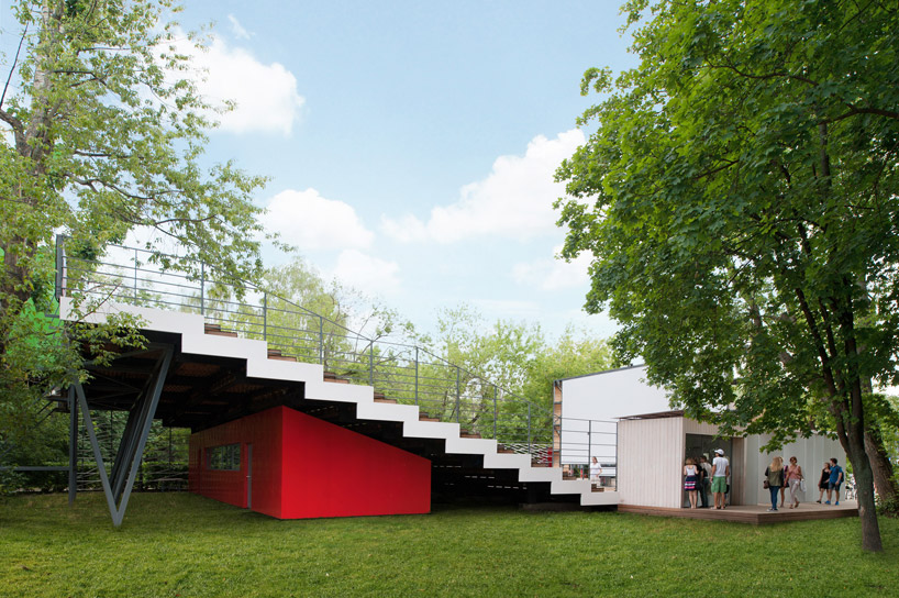 deep wooden steps create sitting areas