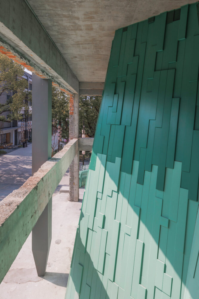 the metal curtain wall is composed of four variations of panels in different colors and thicknesses
