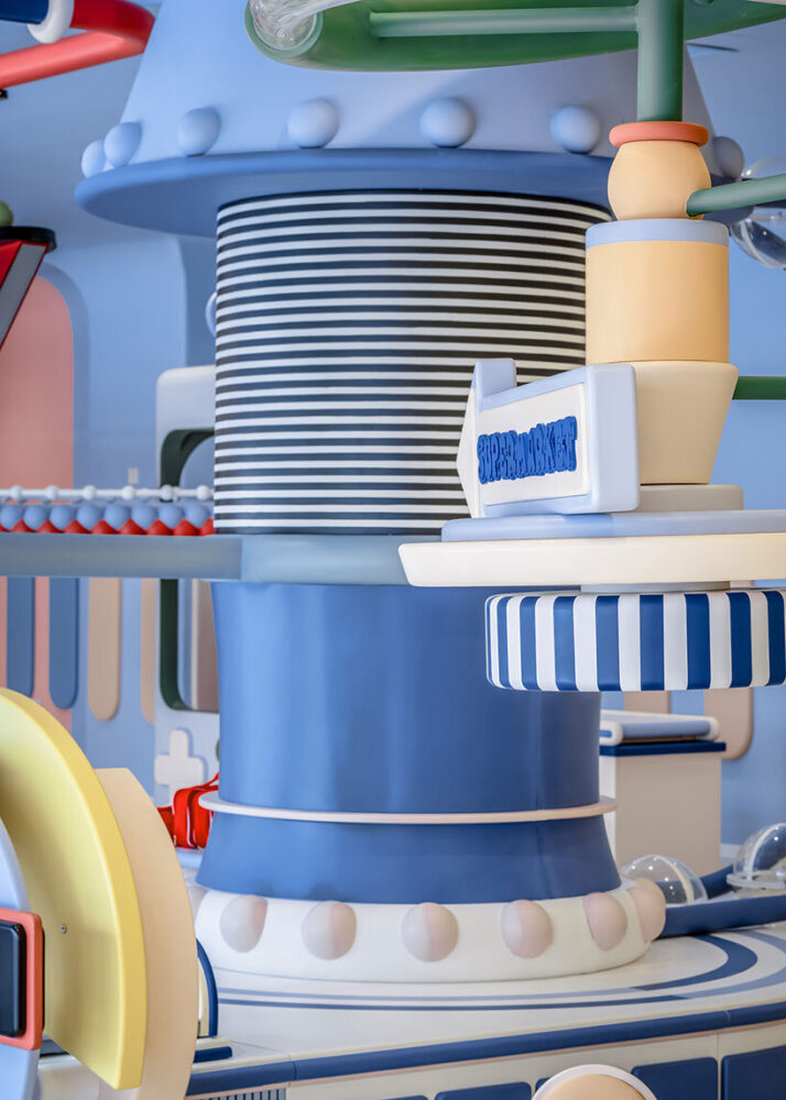 in order for children to learn through experience, the architect has added a simulation city. those incorporated  facilities include supermarkets, hospitals, and other common areas such as a kitchen. the unity of aesthetic makes the space look like a mini city for children.