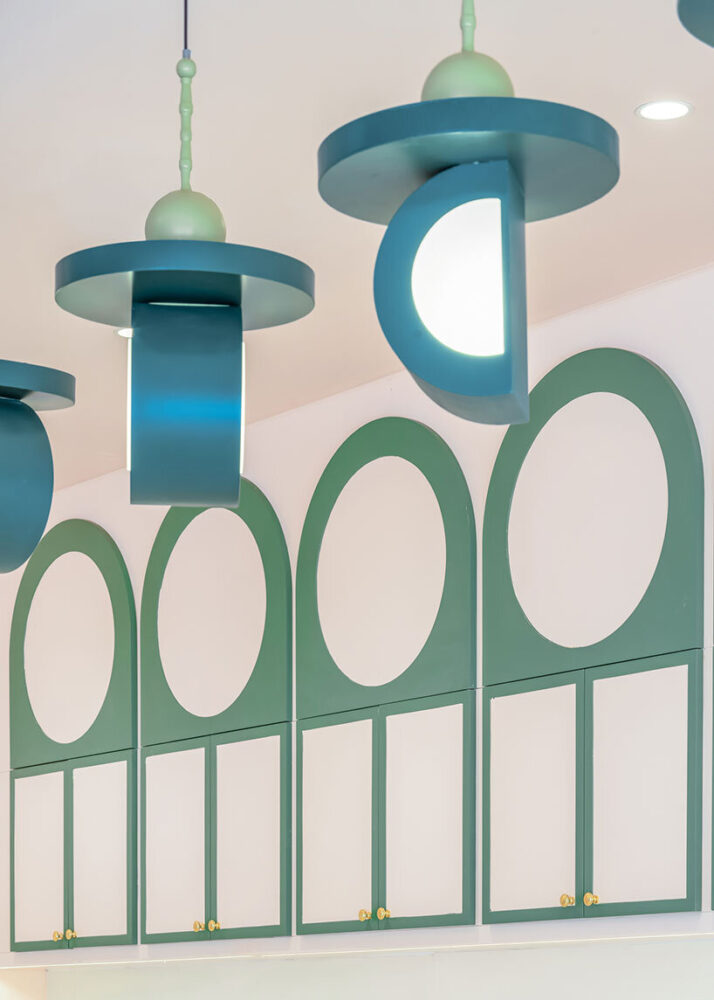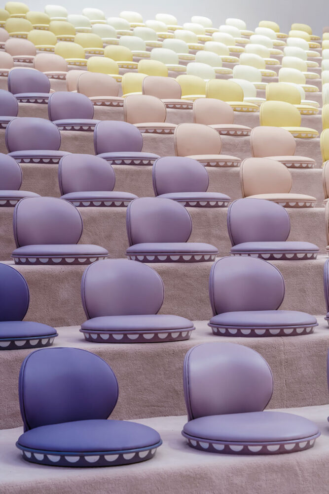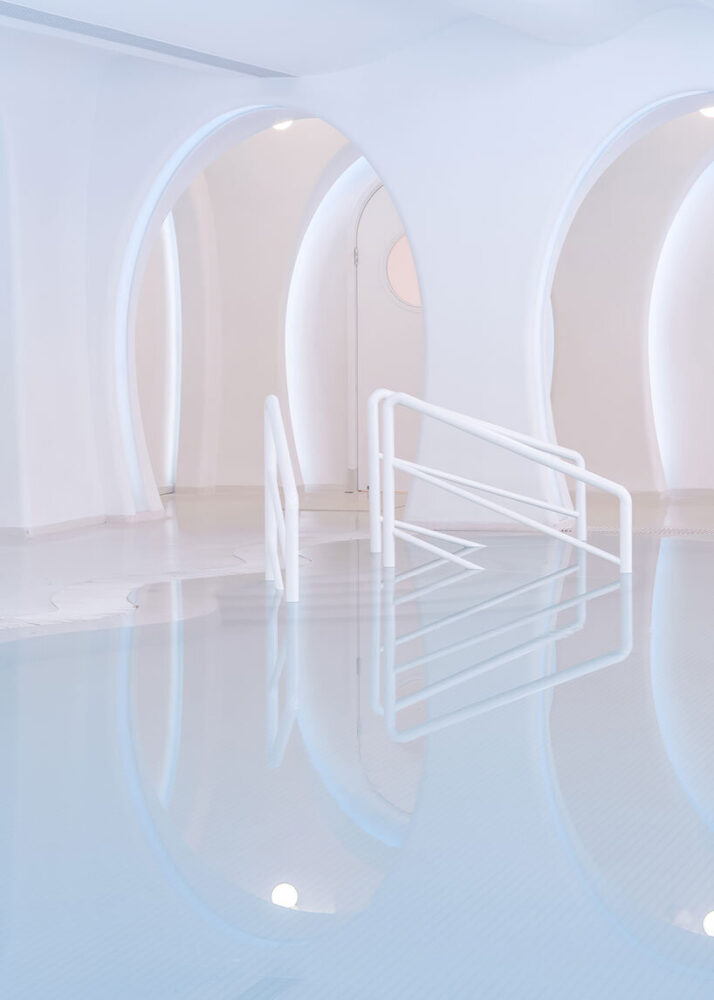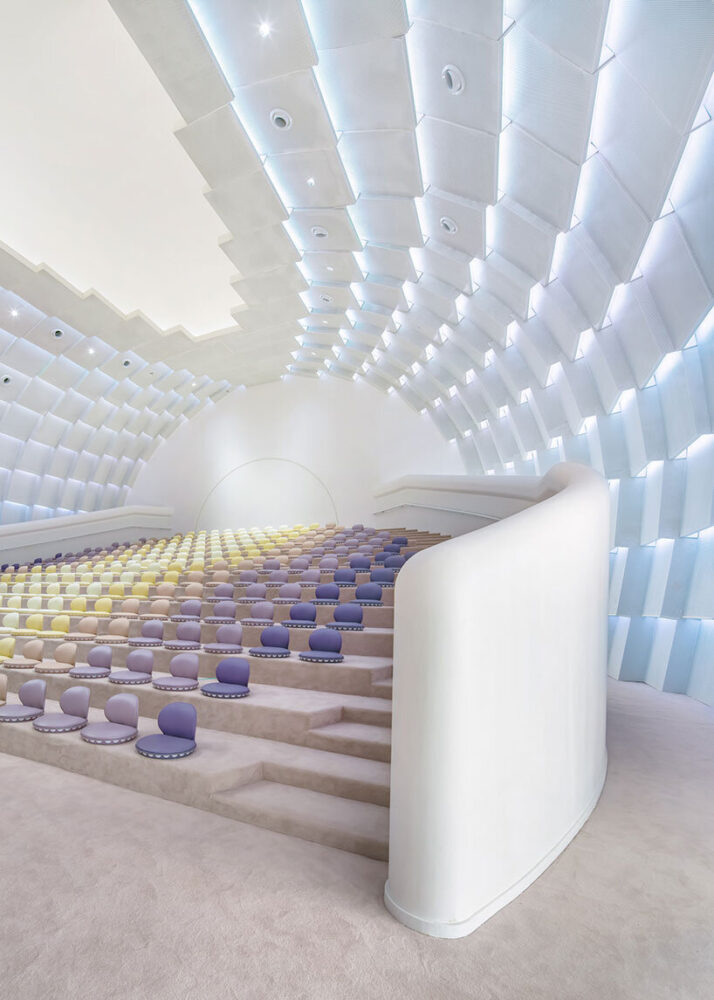 the architects made use of rounded lines depicting the soft shape of clouds in space. this is seen in the swimming pool and auditorium which through softness and pastel colors create a fairy-tale feeling that triggers children’s imagination. in the auditorium the seats with gradient colors make the whole space gently glow.