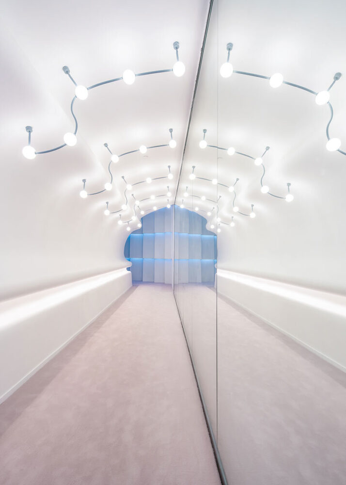 children are welcomed through a lobby that features a galaxy light stripe surrounding six starlike lamps that recall the mystery of astronomy. kids are invited to understand the vastness of the universe in the lobby while white walls provide a space for the school to display relevant information.