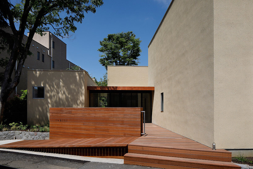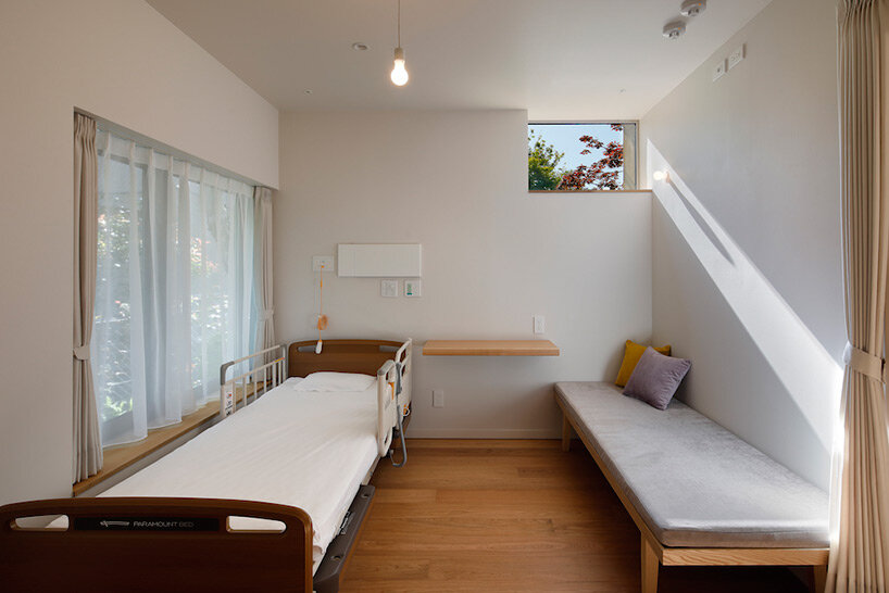 yamazaki kentaro has designed a hospice facility in japan that blends seamlessly with the natural surroundings. the newly unveiled establishment plays an intermediate role between a home and a hospital, providing palliative care for terminally-ill cancer patients. the design seeks to generate a warm environment with a quotidian atmosphere, rather than a typically cold hospital. arranged to avoid the existing trees in the site, the building consists of a compact medical care room and nurses’ station, connected by a corridor that gives sequential continuity to the space and serves as a place for patients to spend time with family and friends.