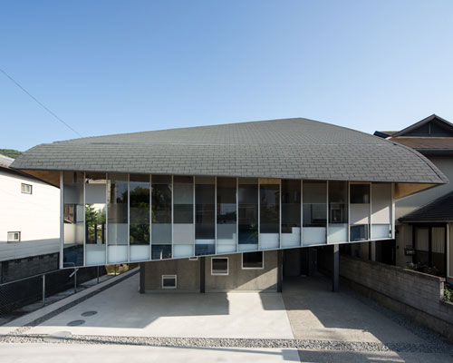 the top heavy structure in a quiet neighbor in tokushima city is a classic ballet school by y+M design office. characterized by a three tier structural form, a mosaic glass wall plays with the degrees of transparencies. the pointed roof form represents a free-hand and fluid motion, giving enough height to allow lifted movements during ballet practice. simultaneously, the exaggerated eaves of the roof canopy acts as a shade and cover for the car and bike parking outside.