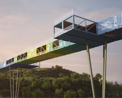 three tree-columns support the bridge, using the container’s structure to span the lengthsimage © yoav messer architects