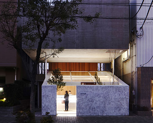bringing a whole new aesthetic to the mixed-use ground floor commercial, top floor residential typology, japanese firm yuko nagayama & associates present the katsutadai house with a literal separation between both programs. on entry level, a small pastry shop faces the street with an inclined glass ceiling that accepts natural light during the day and emanates a bright glow at night. just behind it, a small restaurant accessed from a side door along the outside of the pastry locale. the residence resides on the 2nd and third stories, hovering above the commercial spaces.  each volume has a unique relationship to the exterior an to each other.  the physical air gap between them determines an almost voyeur-like characteristic between home and shop. through one controlled point in a private exterior deck, the owners are able to look through the glass into the store without actually disturbing business. the store on the other hand is completely independent of the home in the sense that it cannot be bothered by any activity happening in the structure above as was previously the case.