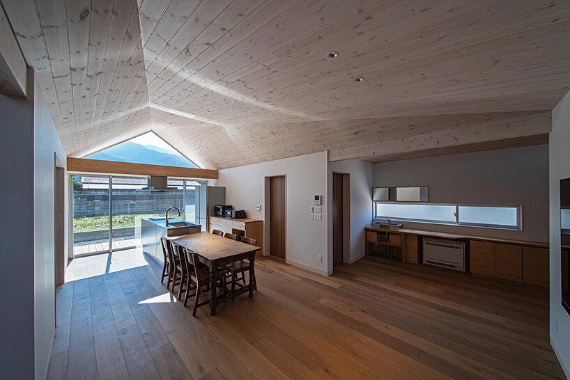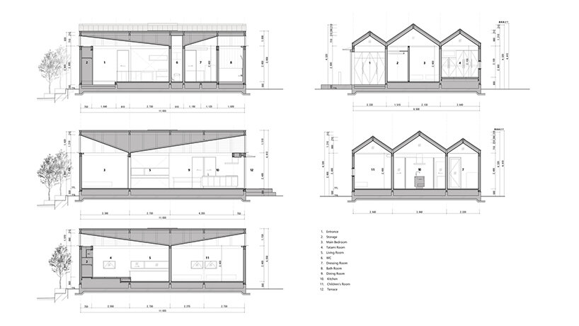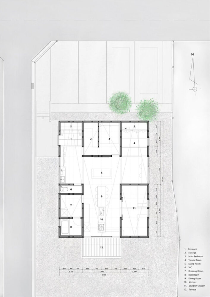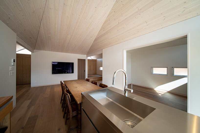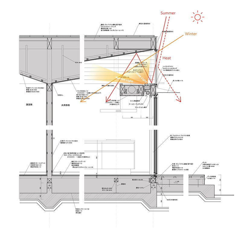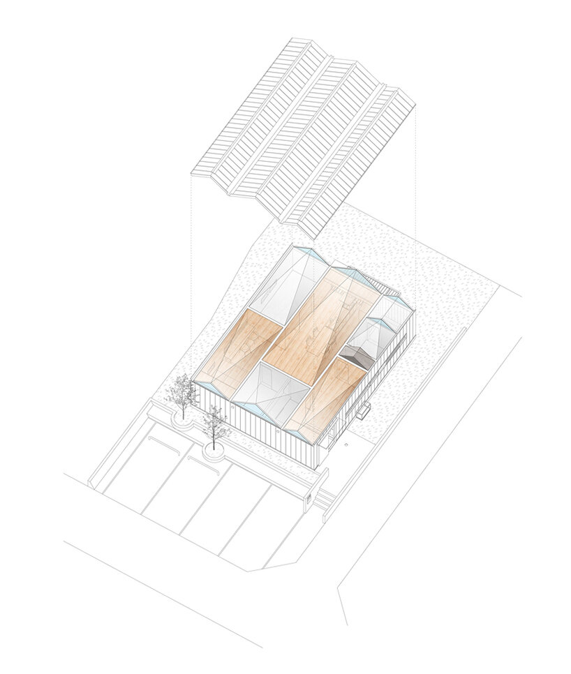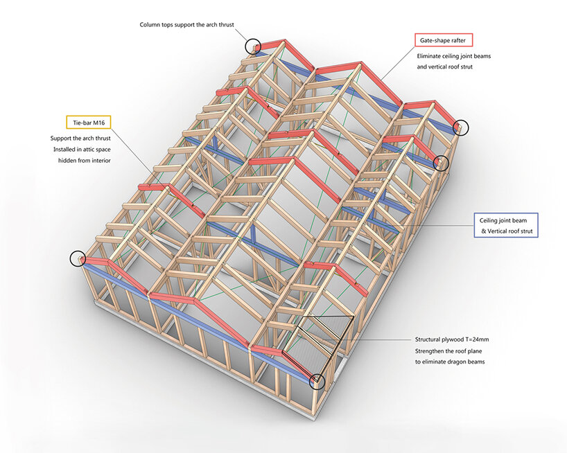 the project sits like a ring placed over the terrain, with its funnel-like roof forming a shaded perimeter walkway and an introverted core.