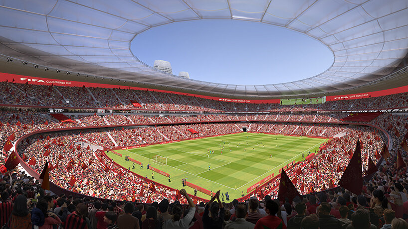 the project sits like a ring placed over the terrain, with its funnel-like roof forming a shaded perimeter walkway and an introverted core.